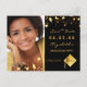 Une photo Enregistrer la carte de date pour une fête de remise de diplômes 2023. Sur le devant : Ajoutez votre propre photo verticale du diplômé. Une couleur arrière - plan noire chic, décorée de faux étoiles dorées. Personnalisez et ajoutez un nom et une date. Lettres d'or. Le nom et le texte : Save the Date sont écrits avec un script de style manuscrit moderne. Retour : détails de la fête.