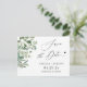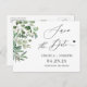 Mariage Sauvegarder la date Elégant vert Eucalyptus Feuilles carte postale. (1) Pour plus de personnalisation, cliquez sur le lien "customiser plus loin" et utilisez notre outil de conception pour modifier ce modèle. (2) Si vous avez besoin d'aide ou d'articles correspondants, veuillez me contacter.