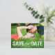 Carte postale faire-part de votre date de mariage. Utilisez votre image horizontale complète avec "Save our Date" sur votre photo. Dégradé noir en option pour le bas de la carte pour faire ressortir le type. Il suffit de cliquer sur l'icône de l'oeil pour l'afficher et de déplacer vers le haut ou vers le bas selon la quantité de dégradé noir que vous voulez. Customisez vos noms et votre date à l'avant et à l'arrière. Il existe une autre carte avec un dégradé blanc de type foncé disponible.