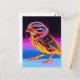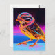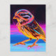Illustration frappante de néon d'un moineau orné d'anneaux brillants et d'accents vibrants, dressé sur un fond audacieux de violets, de bleus et de roses inspiré d'un synthwave. Cette oeuvre d'art ornithologique rétro-futuriste est parfaite pour les amateurs d'esthétique à vague de vapeur, d'art numérique brillant et de portraits d'animaux surréalistes.