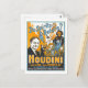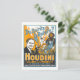 Cette carte postale est la reproduction d'une publicité lithographique vintage pour le célèbre magicien Houdini. L'affiche dit : "Les esprits reviennent-ils ? Houdini dit non - et le prouve" et promet "magie, illusions, évasions = médias de fraude exposés."