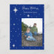 Joyeuses Fêtes sur fond de ciel bleu et d'étoiles scintillantes ! Personnalisez votre photo et votre texte avec cette carte postale des fêtes simple mais élégante.
