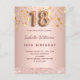 Une invitation moderne, élégante et glamour pour une fête du 18ème anniversaire. Un arrière - plan métallique à l'apparence rose à l'or faux avec des étoiles à gouttes d'or faux. Le nom est écrit avec un rose moderne de couleur or foncé à la main écriture style. Personnalisez et ajoutez les détails de votre fête. Le numéro 18 est écrit avec une police de style ballon, script. Retour : arrière - plan or rose, design carte postale. Conseil : Si vous ne voulez pas qu'il ressemble à une carte postale, cliquez sur customiser, allez à l'arrière et retirez le séparateur et le timbre postal.