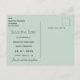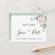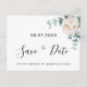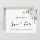 Une carte moderne Save the Date pour un mariage. A l'avant : Un arrière - plan blanc chic décoré de vert aquarellé de végétation eucalyptus, feuilles et sprigs et une pivoine blanche aquarellée, fleurie. Personnalisez et ajoutez vos noms et la date. Lettres de couleur noire. Le texte : Save the Date est écrit avec un grand script de style à la main tendance. Retour : noms, date, lieu du lieu. Couleur arrière - plan verte.