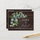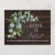 Avez-vous besoin d'informer vos invités mariages que vous avez dû changer votre grand rendez-vous ? Utilisez cette carte postale branchée, s'il vous plaît. Design de carte de charme avec des fleurs d'eucalyptus aquarelle et feuille, typographie moderne "l'amour est patient", sur arrière - plan de bois de grange brun. Sur le dos mêmes feuilles eucalyptus. Utilisez l'outil Personnaliser pour ajouter vos informations. Pour les articles correspondants, veuillez visiter ma collection de célébrations de Mariage reportée.