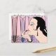 L'adorable Art Déco Eve en profil applique son rouge à lèvres sur fond de design art déco classique. Eve a été aimablement redessinée d'une publicité cosmétique vintage en France. Le design arrière - plan est dérivé de la ferronnerie vintage Art Déco. Cette version présente la belle Ève avec les cheveux noirs jet, l'ombre de l'oeil bleu, les yeux brun foncé et les lèvres roses roses. L'arrière - plan est rose bébé avec ferronnerie dans les tons bleu et noir.