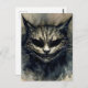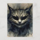 La carte postale présente l'aquarelle féline d'un chat sinistre aux tons neutres et foncés. Le méchant chat rappelle le mystérieux Cheshire cat souriant du chef-d'oeuvre classique de Lewis Caroll, Alice's Adventures in Wonderland ! Idéal pour Halloween ou à tout moment, pour les amateurs de chats et d'ombres.
