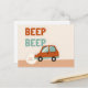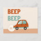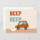 Cette charmante carte postale présente une délicieuse célébration d'un jalon important : le passage d'un examen de conduite. Le recto de la carte postale est dominé par un « BEEP BEEP » typographique surdimensionné et ludique, en nuances alternées de roux chaud et de sarcelle douce, évoquant le son d'un klaxon de manière amicale et invitante. Sous cette proclamation jubilatoire se trouve une représentation stylisée et dessin animé d'une voiture, rendue dans une teinte orange joyeuse qui transmet un sentiment d'excitation et d'énergie.