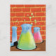 Expériences de Cartoon Science. Tubes d'essai et flacons de verre devant un mur de brique assis sur un banc en bois.