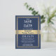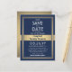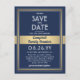 Invitations parents pour sauver la date pour une réunion de famille, pique-nique, barbecue ou fête avec cette élégante invitation de carte postale marine moderne bleu, blanc et faux or. Photo et tout le texte sont simples à customiser. (CONSEIL DE PLACEMENT DE L'IMAGE : Un moyen facile de centrer une photo comme vous voulez est de la rogner avant de télécharger sur le site Zazzle.) Le design comprend une image de votre choix, une bordure d'or avec superposition de faux ruban, une typographie d'inspiration art déco vintage et une calligraphie de script chic. Certaines idées pour une photo pourraient être de la dernière époque où la famille était ensemble, des images vintage de grands-parents / ascendance, ou des images de l'emplacement de la fête. Ce modèle est configuré pour une fête familiale, mais peut être personnalisé pour tout type de réunion, comme une réunion de classe, une conférence ou un événement d'entreprise.