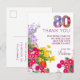 80e anniversaire floral moderne 80 ans de fête Carte postale Faire-part. Célébrez un anniversaire marquant avec ce carte de remerciements de 80 ans magnifiquement conçu, avec des accents floraux vibrants et un élégant graphisme "80". Cette carte offre un moyen sincère d'express gratitude aux amis et à la famille pour leur présence et les cadeaux généreux en cette occasion spéciale. La bordure florale ajoute du charme, tandis que le texte personnalisable assure une touche personnelle. Idéal pour ceux qui veulent une façon mémorable et élégante de dire "merci" après une célébration de 80ème anniversaire. Bon appétit !