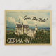Cartes postales vintage Allemagne Sauvegarder la date mettant en vedette le château de Neuschwanstein dans toute sa gloire. Ce design rétro cool du milieu du siècle est la façon parfaite de rassembler les invités à votre mariage de destination en Allemagne.