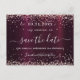 Une carte Save the Date pour une fête d'anniversaire de 21 ans (ou tout autre âge). Un arrière - plan à l'aspect métallique bordeaux et profond décoré de parties scintillant en faux or rose, brille. Personnalisez et ajoutez une date et un nom/âge. Le texte : Save the Date est écrit avec un script de style écrit à la main avec des swashes.