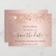 Une petite fille et tendance Enregistrer la carte Date pour une fête d'anniversaire de 40e (ou tout âge). Un arrière - plan rose féminin, rose d'or faux métallique à l'aspect décoré de la poussière de parties scintillant d'or faux rose. Personnalisez et ajoutez une date et un nom/âge 40. Lettres de couleur or rose foncé. Le texte : Save the Date est écrit avec un grand script de style à la main tendance. Retour : arrière - plan or rose, design carte postale. Conseil : Si vous ne voulez pas qu'il ressemble à une carte postale, cliquez sur customiser, allez à l'arrière et retirez le séparateur et le timbre postal.