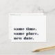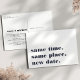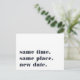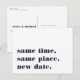 Besoin de reporter ou de reprogrammer votre mariage ? Faites-le savoir à vos invités avec ces cartes postales modernes et légères en blanc avec lettrage bleu marine riche. Un design humoristique et astucieux basé sur la typographie présente "même heure, même lieu, nouvelle date" sur le devant, avec votre nouvelle date de mariage et les détails au dos.