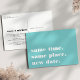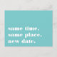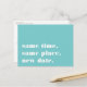 Besoin de reporter ou de reprogrammer votre mariage ? Faites savoir à vos invités avec ces cartes postales modernes et légères dans un bleu aqua vibrant et une écriture blanche croquante. Un design humoristique et astucieux basé sur la typographie présente "même heure, même lieu, nouvelle date" sur le devant, avec votre nouvelle date de mariage et les détails au dos.
