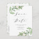 Annoncez votre jour spécial avec élégance et style en utilisant notre carte postale "save the date" personnalisable, qui présente un magnifique design aquarelle de verdure luxuriante et de fleurs blanches délicates. Cette carte postale "save the date" sur le thème de la verdure capture l'essence de la beauté de la nature, créant une invitation romantique et intemporelle que vos invités chériront. Personnalisez votre "save the date" avec vos noms, la date de votre mariage et tout autre détail.
