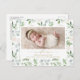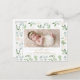 Faire-part de naissance photo élégant et lunatique avec aquarelle motif de verdure et de fleurs blanches. Ce faire-part de naissance photo verdoyant est parfait pour les annonces de naissance de bébé sans sexe. Personnalisez en ajoutant des photos et des détails.