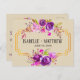 De belles fleurs violettes profondes cascades sur un cadre doré Art Déco sur le devant de cette très jolie carte postale "Save the Date". Les prénoms des mariés sont écrits dans une police inspirée de l'Art Déco, avec leur date de mariage en dessous. Le fond beige doux ajoute à l'ambiance vintage. Le verso de la carte postale "Save the Date" comporte un autre cadre doré avec des fleurs violettes. Cette fois, il contient les initiales du couple. Les informations sur le mariage suivent.
