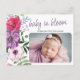Carte postale Faire-part de naissance photo que vous pouvez personnaliser avec votre photo bébé et message. Baby in Bloom est écrit en décontracté écriture manuscrite et le design a une jolie aquarelle automne de l'anémone, pavot et fleur sauvage dans les tons de violet et rose, encadré de verdure délicate. Parfait pour annoncer la naissance de votre bébé au printemps ou en été.