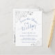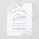 Cette belle carte postale est conçue pour informer vos amis et votre famille à l'avance de votre prochain mariage. Il présente un design simple mais élégant avec un arrière - plan blanc et lacy bleu poussiéreux ou périwinkle couleur calligraphie et frilly argent faux feuille boucles et tourbillons dans les coins. Le dos a un graphique mignon "crayon us in" ainsi que de la place pour un site Web et d'autres informations.