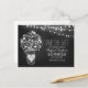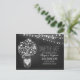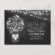 Faire part de mariage carte postale tableau noir avec bocal mason rempli de fleurs sauvages, marguerites, feuilles et cœurs d'amour et lumières scintillantes suspendues au fil. Faire part de mariage romantique et rustique avec grand cœur d'amour et initiales de la mariée et du marié sur fond gris ardoise.