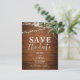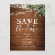 Save The Date présente des feuilles verdoyants et des lampes à cordes sur du bois rustique.