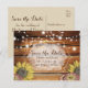 Cette carte de sauvegarde de date postale rustique présente un fond de planche en bois avec de belles lettres et des tournesols vintage.