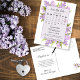 Cette jolie carte de pré-annonce de mariage informera vos amis et votre famille de la date de votre mariage. Le design présente un calendrier personnalisable avec un cœur autour de votre jour spécial dans un cadre lavande ou violet clair entouré d'une abondance de fleurs de lilas peintes à la main. Au dos, un graphique mignon indiquant "réservez-nous" avec un espace pour une note personnelle.