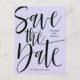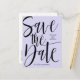 Calligraphie grasse en noir sur fond violet lilas pour cette carte de save the date tendance et moderne.