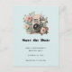 Save the date postcard with a vintage styled camera decorated with flowers. Pastel colors of pink, cream and green.