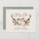 Feuillage rustique, floral et bois de cerf mariage enregistrer la carte de date. Avec un beau feuillage aquarelle, fleurs blanches, tranche de bois et écriture manuscrite. Cette invitation moderne est sûre de définir le style de votre fête à venir. Dos vert sauge.