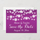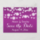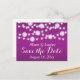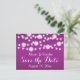 Carte postale de mariage hivernal violet avec une chaîne de lumières et des flocons de neige blancs Enregistrez la date avec une chaîne de lumières scintillantes blanches avec des flocons de neige blancs sur fond dégradé violet. Cette conception de mariage moderne et tendance fait partie d'un ensemble ou d'une collection de mariage, est entièrement personnalisable et est parfaite pour un mariage de Noël hivernal. Certains éléments sont gracieusement offerts par vectorportal.com.