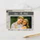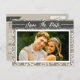Chalkboard Burlap & Lace Photo Save the Date Cards - dispose d'un arrière - plan burlap et dentelle avec une bande imprimée de tableau noir avec Save the Date sur le dessus. Save the Date est dans un script élégant pour un décor rustique ou champêtre ajouté. Changez le couple de démonstration en une photo de votre choix.