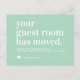 Your Guest Room Has Moved Moving Faire-part avec un script moderne et une typographie de police et un coeur. Les couleurs peuvent être changées facilement en cliquant sur personnaliser, puis cliquez pour customiser plus loin pour voir notre sélecteur de couleurs. Contactez notre magasin si vous avez besoin d'aide.