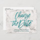 Élégante annonce de report de mariage ou de changement de date en marbre, avec une lettre d'écriture tendance disant "Changer la date" en paillettes scintillantes de turquoise sur un fond de marbre blanc et gris classe. Pour une demande personnalisée, veuillez écrire à citronelladesign@gmail.com