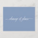 Cette carte postale simple est une façon élégante et sophistiquée de faire savoir à vos invités si vous êtes dans la malheureuse position de devoir modifier ou reporter vos plans de mariage. Le devant est d'une couleur bleu clair et porte la mention "changement de plans" en calligraphie blanche élégante, et le dos comporte un espace pour une note personnalisée où vous pouvez expliquer la situation à vos invités.