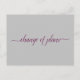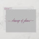 Cette simple carte postale est un moyen élégant et sophistiqué de faire savoir à vos invités si vous êtes dans la malheureuse position de devoir modifier ou reporter vos plans de mariage. Le recto est gris avec un texte cassis violet ou magenta indiquant "changement de plans" en calligraphie élégante, et le verso dispose d'un espace pour une note personnalisée où vous pouvez expliquer la situation à vos invités.