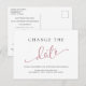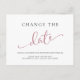 Faites savoir à vos invités que la date de votre mariage a changé avec cette chic et simple carte postale de changement de date de mariage rose, noir et blanc. "Change the" est écrit dans une typographie classique noire élégante et "date" dans un script rose contemporain, et en dessous, vous pouvez personnaliser vos noms et vos nouvelles informations de date de sauvegarde. Au verso, vous pouvez personnaliser votre message plus en détail.