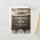 Carte de changement de date de mariage rustique avec un fond de tonneau de chêne, des guirlandes lumineuses, des fleurs de bébé respirant, votre monogramme et un modèle de sauvegarde de la date. Trouvez d'autres cartes de changement de plan sur www.zazzle.com/special_stationery.