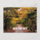 Rustique, mariage de automne enregistrer la date. Un chemin de terre à travers les bois montre de beaux feuillages de la Nouvelle-Angleterre. Faire-part mariage de carte postale abordable.