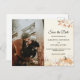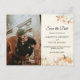 Annoncez votre mariage avec style avec cette carte "Save the Date" florale automnale rustique. Présentant un mélange chaud de tons beige neutre, de roses aquarelles et de feuillage automnal doux, ce design complète parfaitement les mariages automnaux confortables. La typographie de script élégante équilibre parfaitement avec l'arrangement floral rustique, tandis qu'une option de photo personnalisable ajoute une touche personnelle. Un choix intemporel pour les couples qui planifient une célébration automnale romantique, cette carte donne le ton parfait pour votre jour spécial.