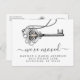 Carte de notification de déménagement dans une nouvelle maison avec une clé ancienne ornée. Ce design élégant en noir et blanc présente une belle clé ancienne finement gravée. Personnalisez ce design personnalisé avec vos propres détails.