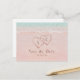 Comprend deux cœurs dans le sable et les initiales de la mariée et du marié sur une plage de sable rose romantique avec de l'eau turquoise, de superbes cartes pour annoncer votre mariage sur une plage rose ou un mariage à destination comme les plages de sable rose des Bermudes, des Bahamas, de Grèce, de la Barbade, etc.