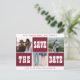 Carte postale de mariage à enregistrer moderne et contemporaine de style géométrique avec une typographie audacieuse dans un bleu marine foncé et blanc avec un collage de trois photos carrées. ++++++ Personnalisez-la avec vos photos et détails ! +++++++++++++++++++ Veuillez noter que la couleur de fond bordeaux et la couleur et les polices de lettrage sont changeables des deux côtés. Vous pouvez les modifier après avoir sélectionné l'option PERSONNALISER.