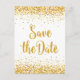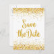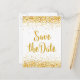 Conception de texte moderne pour annoncer la date de sauvegarde avec paillettes dorées. Fond blanc avec des étincelles dorées en haut et en bas.
