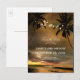 Cartes postales d'enregistrement pour un mariage à destination ou sur la plage avec des palmiers, un coucher de soleil et des guirlandes lumineuses