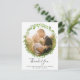 Carte de remerciement de mariage rustique avec votre photo à l'intérieur d'une couronne de feuilles d'olivier vert. Votre message et vos noms sont en dessous dans une police gris moyen. Ce design est idéal pour un mariage d'été.