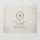 Une carte postale de sauvegarde de mariage comportant une couronne verte avec monogramme sur un fond de brique blanche. Les invitations de mariage assorties et d'autres articles de coordination peuvent être trouvés à Jill's Paperie.