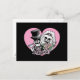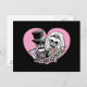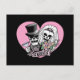 Des crânes de mariée et de mariée habillés dans leur meilleur mariage, posés sur un coeur rose avec JUST MARRIED! texte.